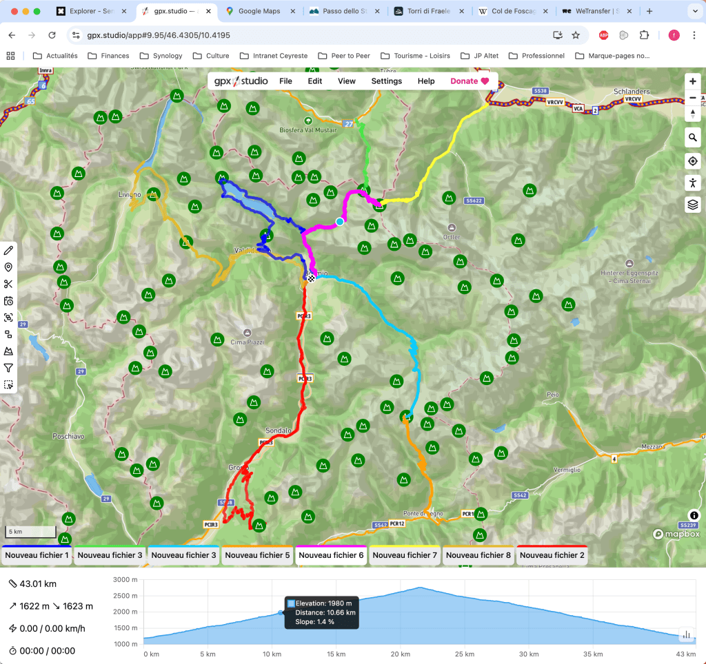 La photo d’écran ci-dessus vous montre la configuration de gpx.studio quand on a ouvert les 8 fichiers gpx.