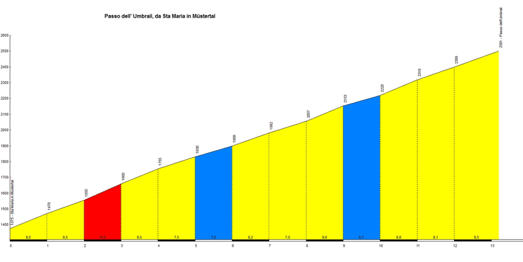 En fait il s’agit du 3° versant du Stelvio dont l’Umbrail est un point de passage et la fin (3 km) commune au versant de Bormio. C’est un très beau col, très varié, avec très vite un décor de haute montagne, assez peu de circulation et un peu moins dur que les deux autres versants (mais moins long).