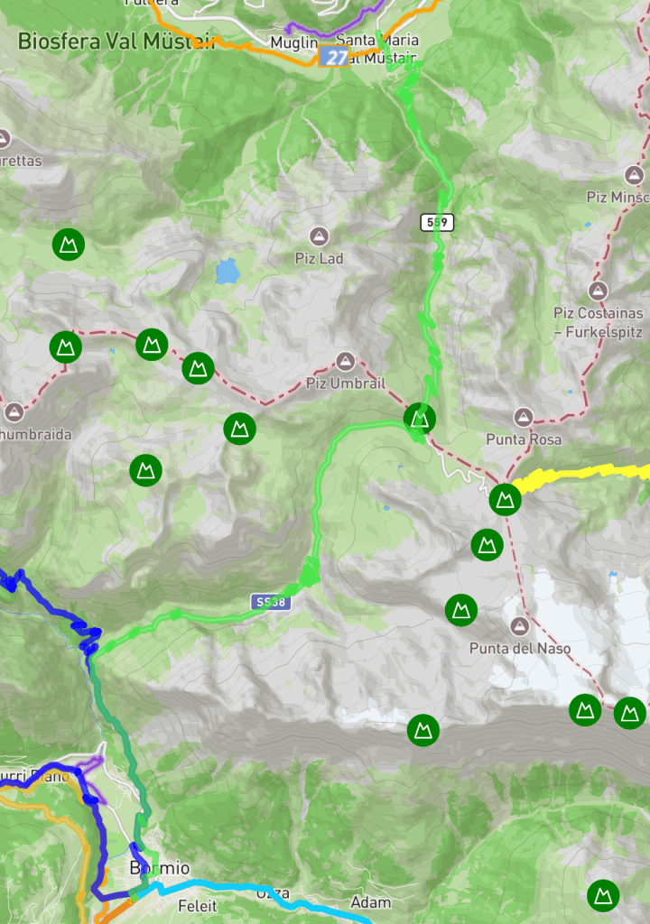 Le col rejoint la route SS38 du côté italien, c’est-à-dire la route qui va de Bormio au col du Stelvio.