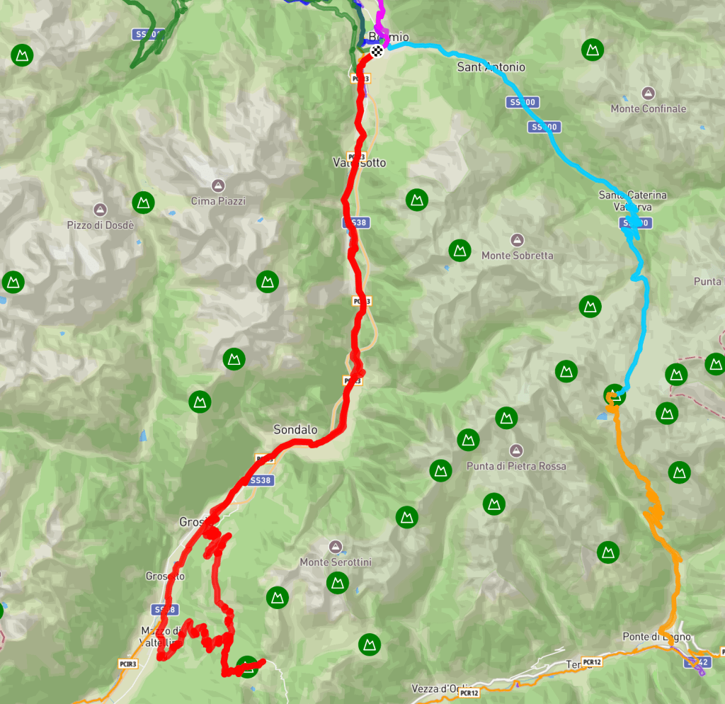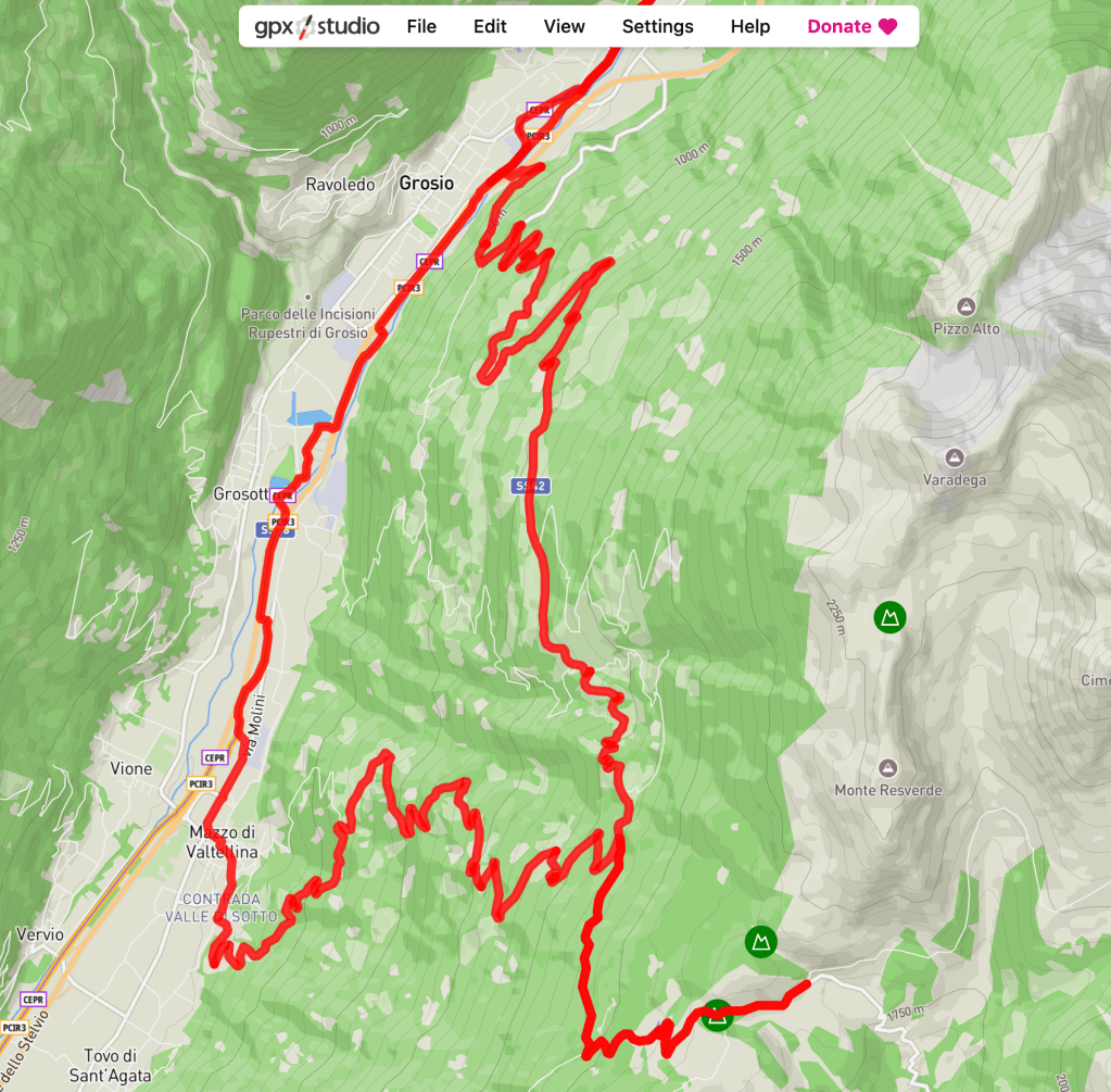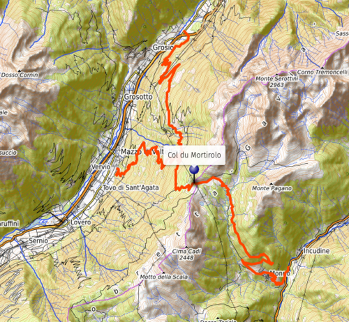 - Commençant à Grosio (656 m), c’est l’itinéraire le plus facile du côté de la Valteline, avec une longueur de 14,8 km et une pente moyenne de 8,3%. Les rampes avec pente maximale (14%) sont situées au 10e kilomètre. À 11,5 km (1 548 m), la route rejoint celle venant de Mazzo. (C’est celui-ci qui est proposé dans ce programme).