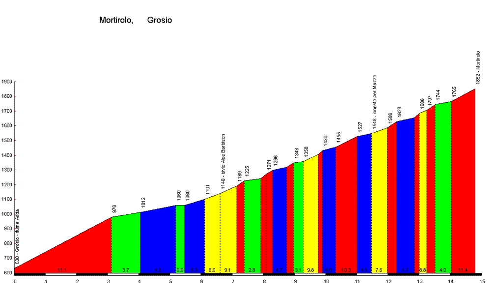 - Commençant à Mazzo di Valtellina (552 m), l’itinéraire est considéré comme l’une des montées les plus difficiles d’Europe et constitue un lieu de « pèlerinage » pour de nombreux cyclistes qui s’essayent à des ascensions difficiles. La montée est longue d’environ 12,4 km pour un dénivelé de 1 300 m, ce qui correspond à une pente moyenne de 10,45%. Cependant, certaines portions sont plus raides : la montée présente un passage à 14%, quatre à 18% et huit à 15%. La montée commence par la via Valle et passe près du château de Pedenale. Les pentes les plus fortes sont atteintes entre l’église de San Matteo (km 3,5) et l’indication de la localité de Pantan (km 4,5). Dans la section comprise entre le troisième et le neuvième kilomètre, les pentes ne descendent jamais en dessous de 11%. Les meilleurs professionnels le courent en moins de 45 minutes (Ivan Gotti détient le record avec 42 min 40 s dans le Tour d’Italie 1996). Cependant, des cols encore plus difficiles existent, comme le Monte Zoncolan dans le nord-est de l’Italie, l’Angliru en Espagne dans les Asturies, ou encore le Kitzbüheler Horn, en Autriche, au-dessus de Kitzbühel.